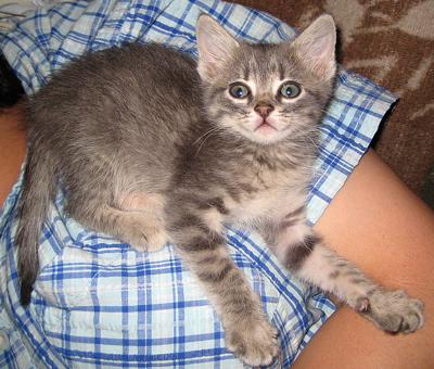 A little ball of gray fluff to be exact--and kitten food, of course. The shelter that was featuring the corral of kittens for adoption that day thought that he was about 7 weeks old, though he was very, very tiny.